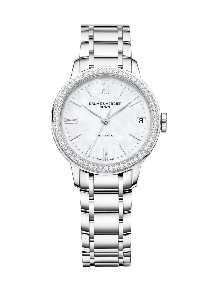 Die Baume & Mercier Classima Lady 31mm M0A10479 ist eine stilvolle Uhr, die aus hochwertigem Edelstahl gefertigt ist. Das Gehäuse hat eine runde Form und einen Durchmesser von 31mm. Die Uhr ist 50m wasserdicht und die Lünette ist mit Diamanten besetzt. Der Gehäuseboden ist massiv und das Uhrglas besteht aus kratzfestem Saphirglas. Der Aufzug ist ein Automatikwerk und das Kaliber ist ein ETA 2892. Das Zifferblatt ist perlmuttfarben und die Indexe sind römisch. Das Armband ist ebenfalls aus Edelstahl und silberfarben. Es hat eine dreifache Sicherheitsfaltschließe.