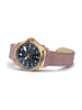 Das Gehäuse der Hamilton Khaki Aviation Pilot Auto ist aus robustem 316L-Edelstahl gefertigt und mit einer edlen PVD-Beschichtung in Roségold veredelt. Die runde Form des Gehäuses hat einen Durchmesser von 36mm und ist bis zu 100m wasserdicht. Der offene Gehäuseboden gibt Einblick in das präzise Automatik-Uhrwerk der Uhr.