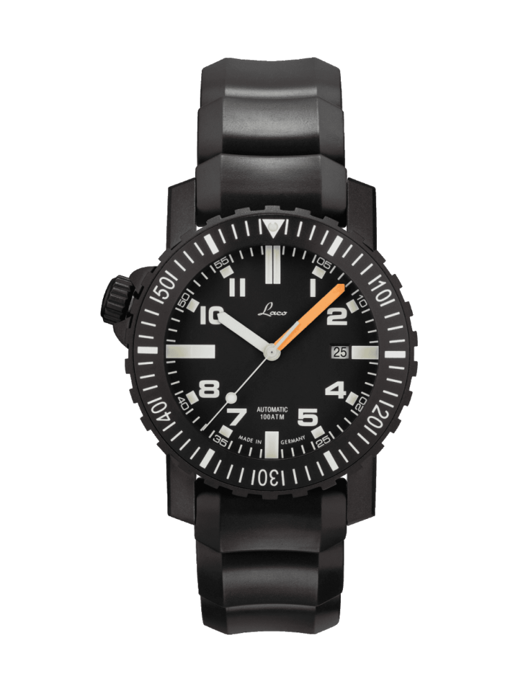 Das beidseitig entspiegelte Saphirglas und das Automatikwerk Laco 200, Qualitätsstufe Elaboré, sorgen für eine präzise und zuverlässige Zeitmessung. Das schwarze matt Zifferblatt mit erhabenen Leuchtindexen und arabischen Ziffern Superluminova C3, Minuterie weiß, Sekundenzeiger weiß mit Superluminova C3, Stundenzeiger Superluminova C3, Minutenzeiger Superluminova orange und Datum, verleiht der Uhr ein klassisches und zeitloses Design.