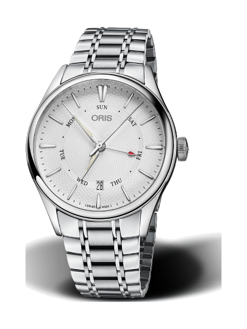 Die Oris Culture Artelier Pointer Day Date ist eine Uhr aus Edelstahl, die sich durch ihr rundes Gehäuse, einem Durchmesser von 40mm und einer Wasserdichte von 50m auszeichnet. Der verschraubte Edelstahl-Gehäuseboden und das Saphirglas bieten einen exzellenten Schutz, und die Innenseite des Glases ist entspiegelt. Das Uhrwerk besteht aus 26 Steinen und ist ein beidseitig aufziehender Rotor mit Automatik. Das Basiskaliber ist Sellita SW 220-1 und es hat einen Durchmesser von 25.6mm. Die Gangreserve des Uhrwerks beträgt bis zu 38h und das Kaliber ist Oris 755. Es hat 28800 Halbschwingungen pro Std. – 4 Hz. Das Zifferblatt ist silber und guillochiert.