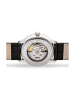 Das Uhrwerk der Uhr ist ein ETA C07.611 Automatikwerk mit 25 Steinen und einer Gangreserve von bis zu 80h. Es hat ein cremefarbenes Zifferblatt mit Strichen als Index. Das schwarze Lederarmband hat eine Faltschliesse und eine Referenznummer 07.08985.10.