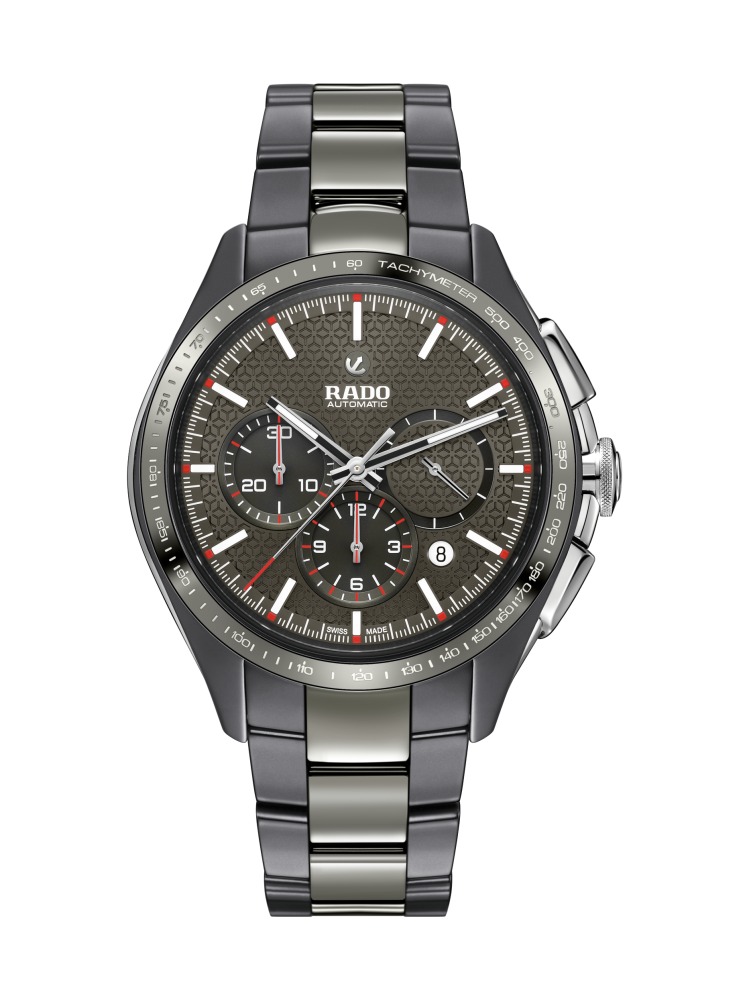 Dank ihrer Monobloc-Gehäusekonstruktion aus matter Plasma-Hightech-Keramik ist die HyperChrome Automatic Chronograph Limited Edition leicht, kratzfest und hypoallergen. Für ein einzigartiges und äusserst komfortables Trageerlebnis sorgt zudem das dazu passende Armband aus Plasma-Hightech-Keramik. Das graue Zifferblatt mit per Lasertechnik aufgebrachtem Dekor und erweiterten Stundenindizes mit weissem Super-LumiNova® ist farblich perfekt auf die rhodiumfarbenen Zeiger abgestimmt. Abgerundet wird das Modell mit einer Lünette mit eingraviertem Tachymeter und Füllung aus weissem Lack. Angetrieben wird es mit dem bemerkenswerten Chronographenwerk vom Kaliber R650, das über eine Gangreserve von 47 Stunden verfügt. Das Modell hat einen Durchmesser von 45 mm und ist bis zu einer Tiefe von 100 m wasserdicht. Ausserdem ist die Uhr nicht nur sportlich und zugleich elegant, sondern wird auch über Jahre hinweg ihre Farbe und ihren Glanz behalten.