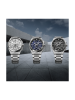 Die graue Lünette und der Gehäuseboden aus massivem Titan mit Super-Hard-Coating verleihen der Uhr einen modernen und robusten Look. Das Uhrglas besteht aus kratzfestem Saphirglas mit Super-Clear-Beschichtung, das eine klare Sicht auf das vertikal gebürstete blaue Zifferblatt bietet. Die Strichindizes und die lumineszierenden Zeiger sorgen für eine ausgezeichnete Ablesbarkeit, auch bei schlechten Lichtverhältnissen.