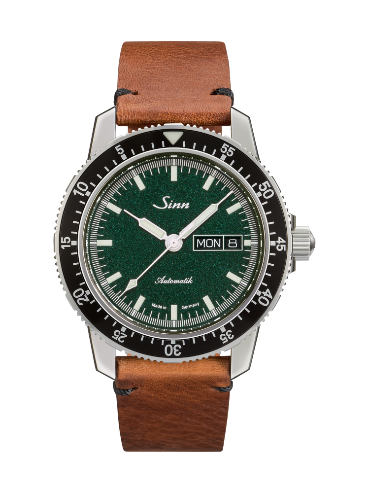 Die Sinn Instrumentelle Uhr 104 St Sa I MG 104.0131 besteht aus einem Edelstahlgehäuse, das poliert wurde und einem runden, 41mm großen Gehäuse, das 11,5mm hoch ist. Sie ist 200m wasserdicht und hat einen Sichtboden. Das Uhrglas besteht aus Saphirglas und das Uhrwerk hat 26 Steine. Es ist ein Automatikwerk mit einer Gangreserve von bis zu 38h und einem Sellita SW 220-1 Kaliber, das 28800 Halbschwingungen pro Stunde schlägt. Das Zifferblatt ist grün und hat Striche als Index. Das Armband ist aus Leder mit einer Vintage-Optik und brauner Farbe. Es hat eine Dornschliesse und einen Bandanstoß am Gehäuse von 20mm.