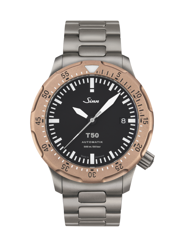 Die Sinn Taucheruhren T50 GBDR 1052.020 sind ein perfektes Beispiel für die hochwertigen Taucheruhren von Sinn. Seit 1961 produziert die deutsche Marke Sinn Uhren, die nicht nur einzigartiges Design, sondern auch hochwertige Materialien und einwandfreie Verarbeitung bieten. Die Sinn Taucheruhren T50 GBDR 1052.020 sind aus einem perlgestrahlten Titan-Gehäuse mit einem Durchmesser von 41mm und einer Höhe von 12,3mm gefertigt. Das Gehäuseboden ist verschraubt und massiv. Die Uhr ist 500m wasserdicht und die Lünette ist aus Goldbronze. Das Uhrglas ist aus Saphirglas und das Uhrwerk besteht aus 25 Steinen mit einem Automatikaufzug und einer Schwingungszahl von 28800 Halbschwingungen pro Stunde. Das Zifferblatt ist schwarz und die Indexe sind in Form von Strichen gestaltet. Das Armband ist 2-gliedrig, perlgestrahlt und aus Titan. Die Farbe des Armbands ist Stahl und die Schließe ist tegimentiert und eine Faltschliesse. Der Bandanstoß am Gehäuse beträgt 20mm. Darüber hinaus verfügt diese Uhr über eine Ar-Trockenhaltetechnik, Anti Magnetisch, verschraubte Krone, drehbare Lünette, Sekundenstopp, Datumsanzeige, Zentralsekunde, Leuchtzeiger und Leuchtindizes.