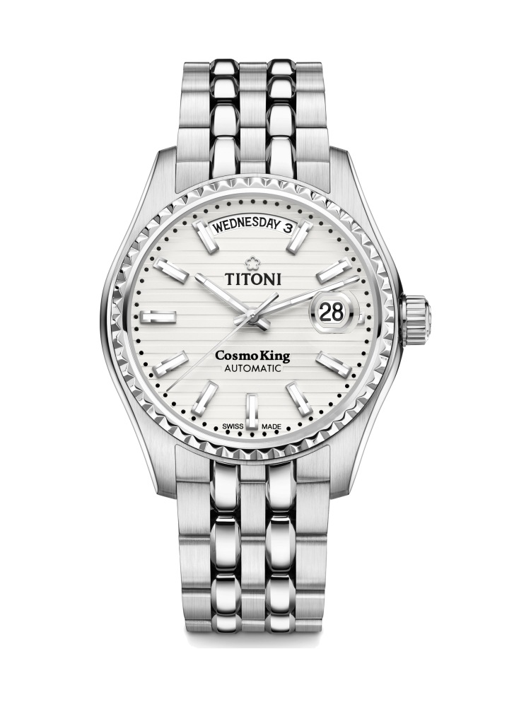 Das prägende Designelement dieser Uhr sind die horizontal verlaufenden, balkenartig erscheinenden Vertiefungen auf dem Zifferblatt. Sie geben diesem Zeitmesser eine moderne Eleganz, die durch die kannelierte Lünette noch verstärkt wirkt. Prägnant gestaltet sind auch die mit Superluminova bestückten Stundenindexe. In das Saphirkristallglas ist eine Zykloplinse integriert, die das Datum vergrössert und dadurch das Ablesen erleichtert. Die Taganzeige in prominenter 12-Uhr-Position sorgt dafür, dass Sie auf einen Blick erkennen können, welcher Wochentag ist. Diese Uhr ist eine perfekte Begleiterin zu Ihrer Festtags- und Abendgarderobe.